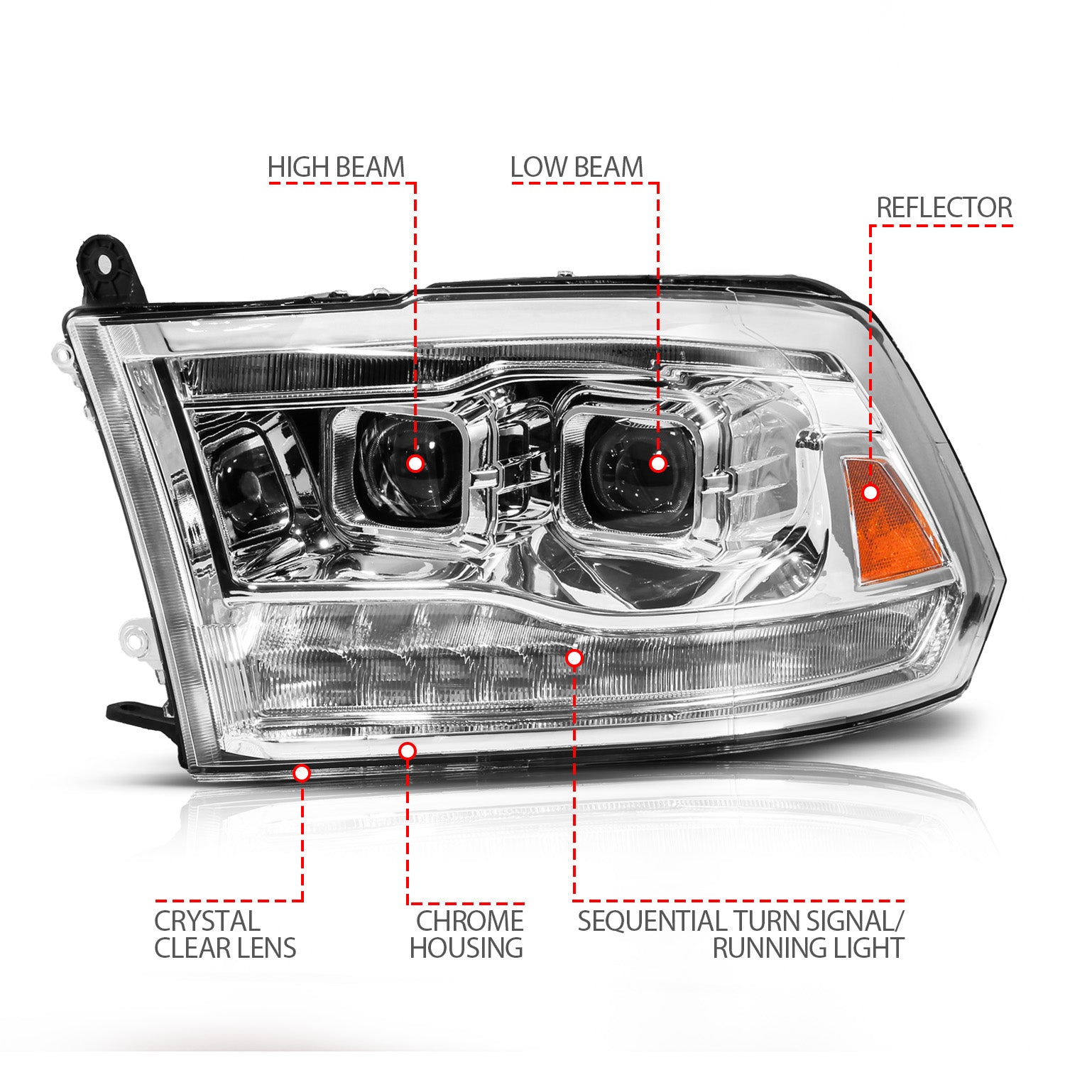 DODGE RAM 1500 09-18 / 2500/3500 10-18 PROJECTOR HEADLIGHTS CHROME CLEAR LENS W/ SEQUENTIAL SIGNAL (FOR ALL MODELS)